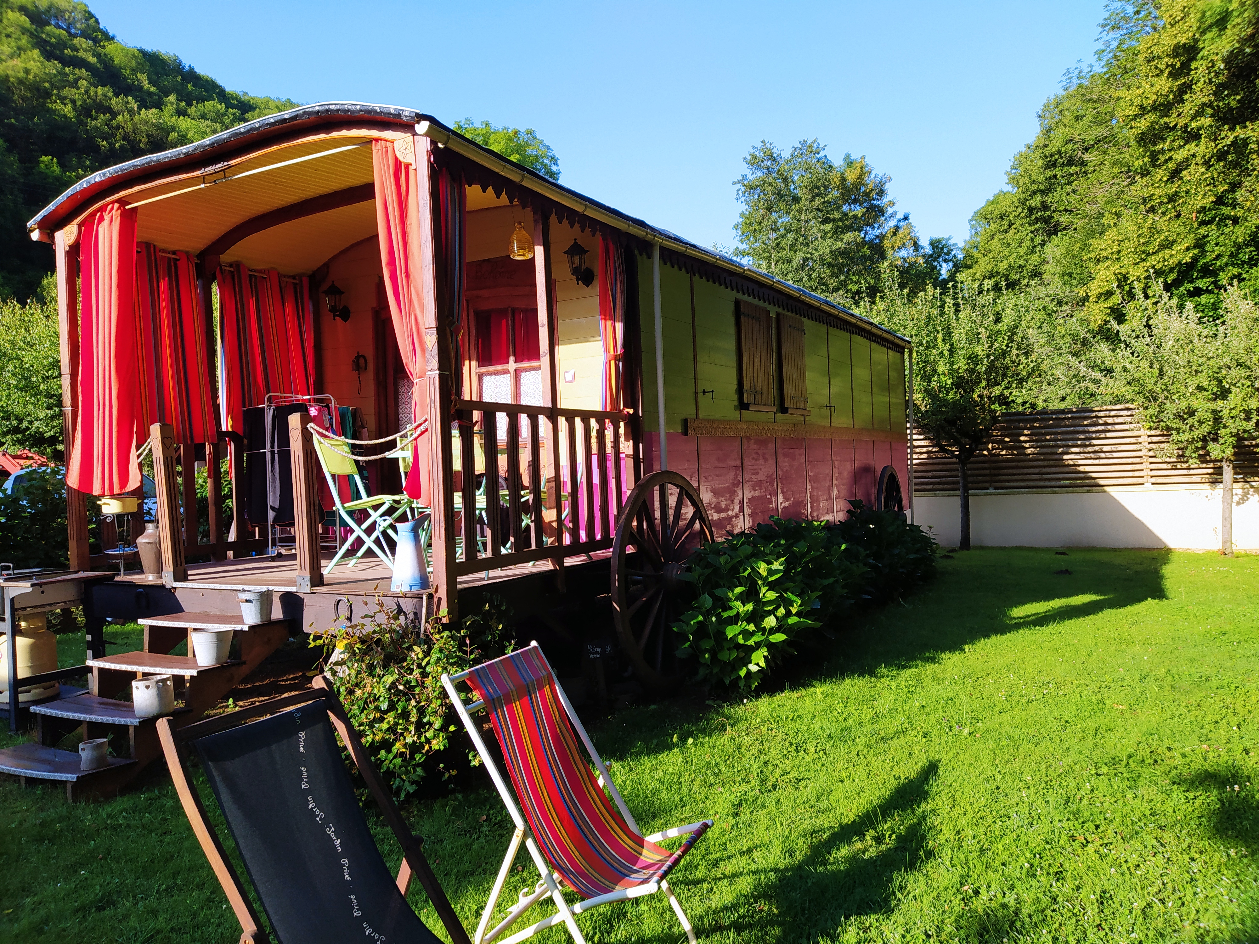 Un tres agréable logement dans une roulotte charmante et confortable, dans une belle verdure au bord de la rivière. Accueil très gentil et excellent petit déjeuner. Françoise et Chantal