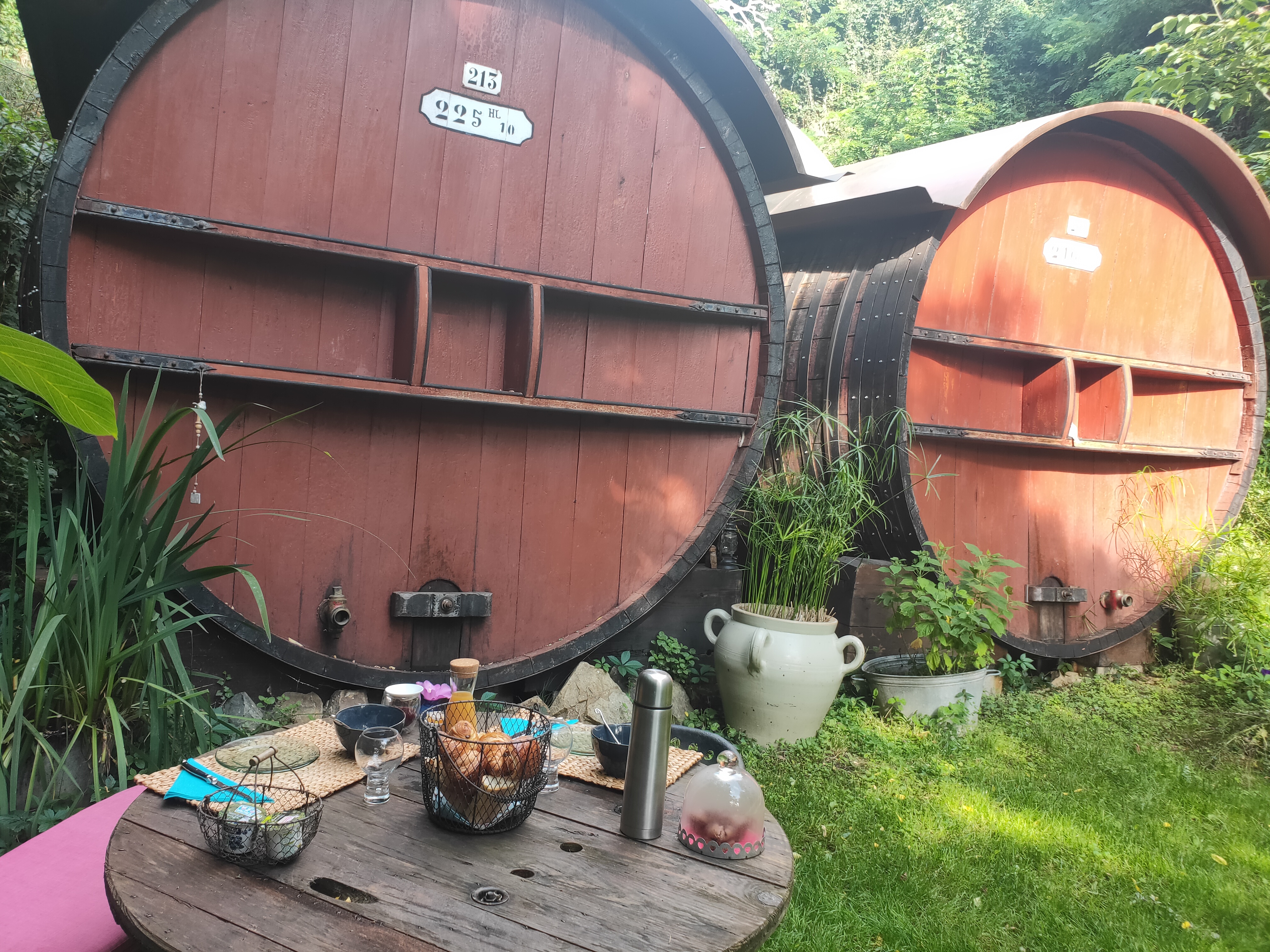 Une belle expérience atypique, une belle nuit hors du monde dans ces foudres de bois au fond d'un écrin de verdure. Une belle rencontre avec Cécile et Alban autour de leur vin du cru Morgon. Merci